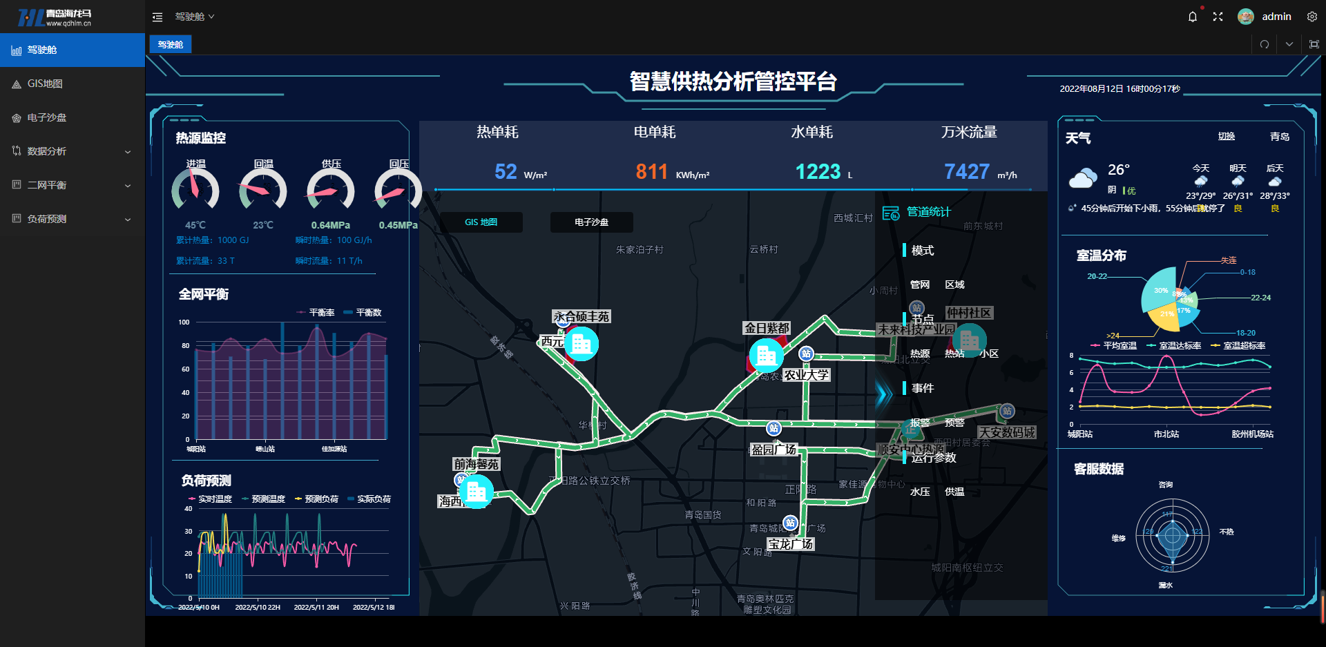 通过在二网末端部署智能平衡控制系统,实现二网水力平衡和热力平衡;同时,通过集中采集住户的室温,结合室外天气数据及历史数据,进行智能化运算和分析,为换热站系统反馈控制数据实现个性化控制目标。最终通过数据采集与分析,实现对热源负荷的实时计算与修正,优化热网的调度,既实现热网的节能环保运行,又保证对住户良好的供热效果。