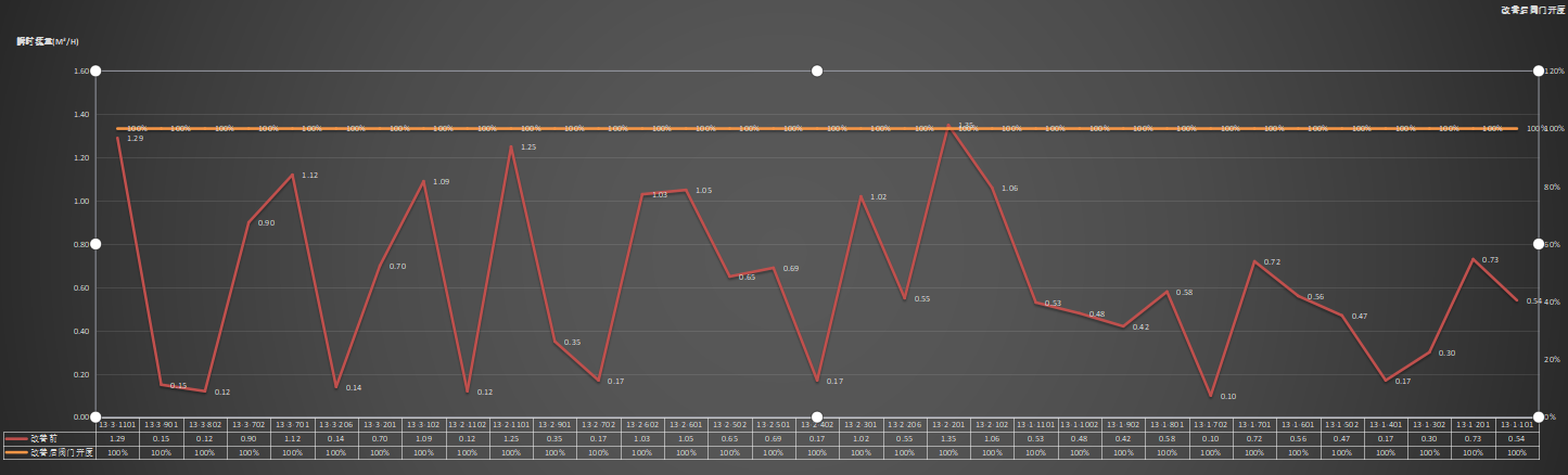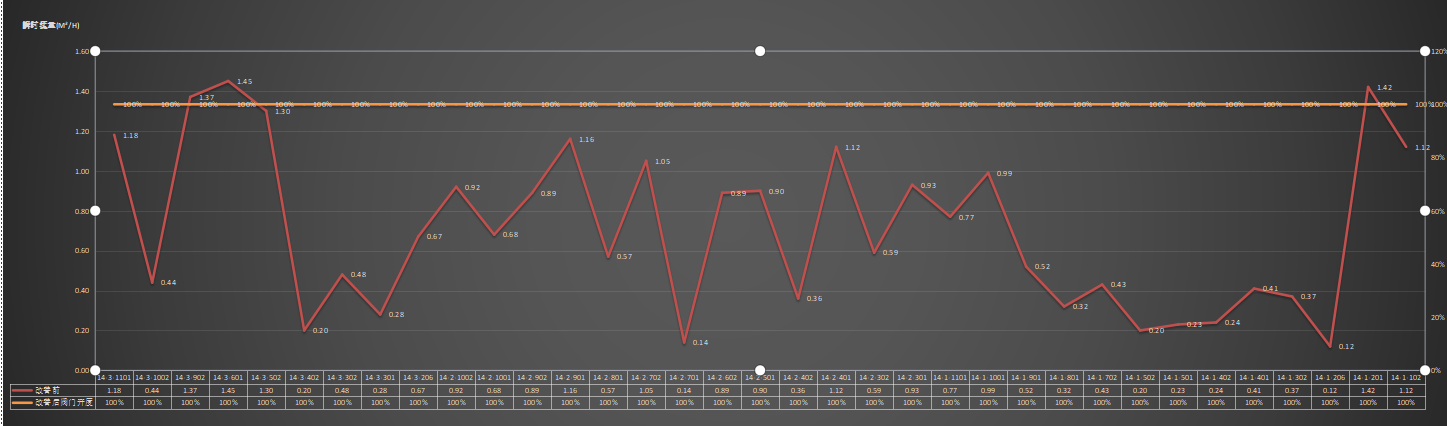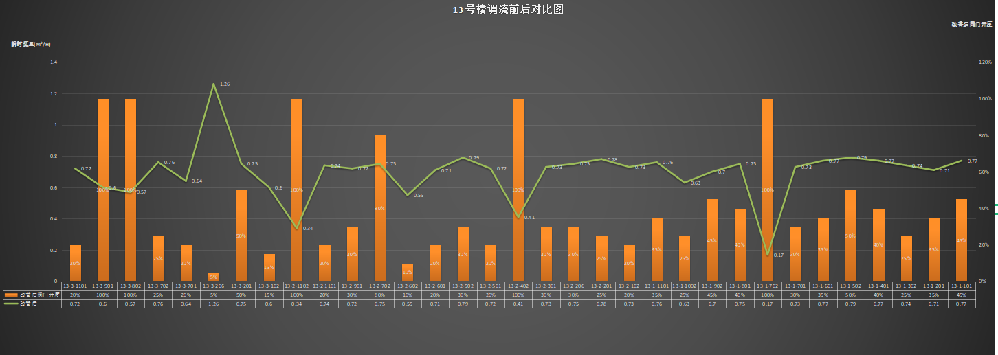 通过对比可以发现,调节后大流量的住户通过减小阀门开度达到了降低流量的效果,小流量住户达到增加效果。