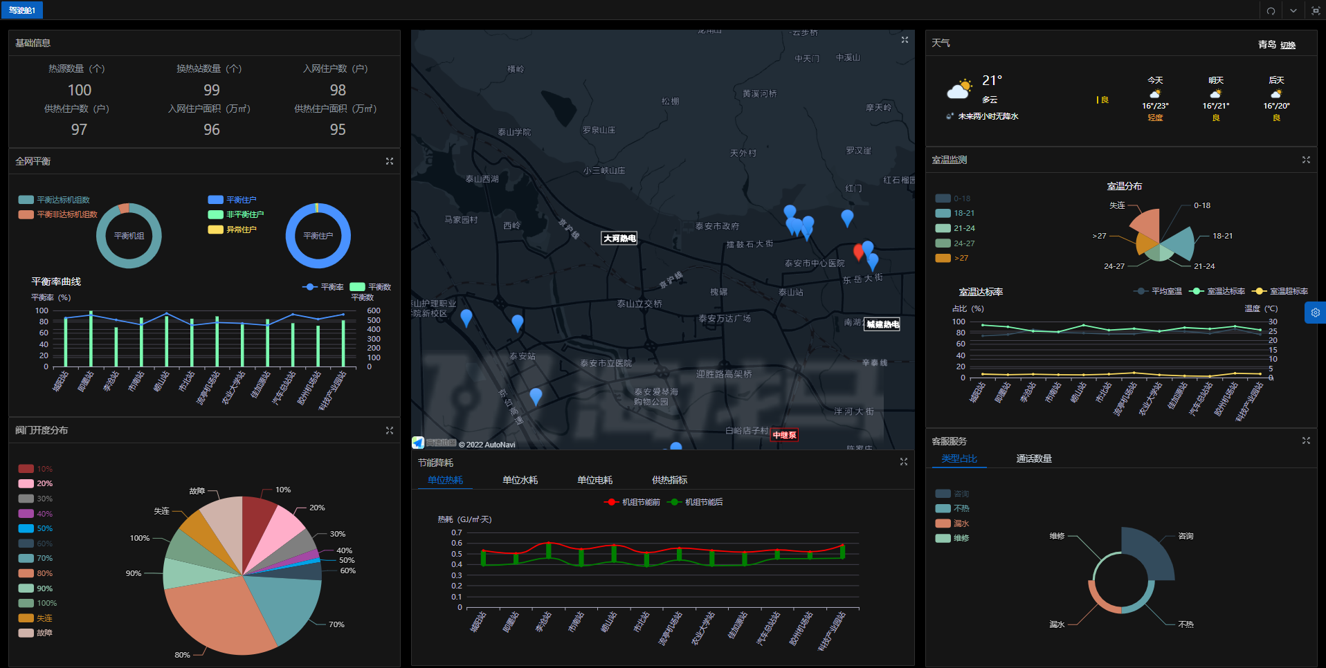 二网平衡解决了水力失调和热量的按需分配,是智慧化供热的第一步,可根据天气变化对供热进行质调节。我公司智慧供热平台可以实现负荷预测功能,用来指导换热站运行,节热10%以上。